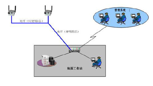 2、每個(gè)地面無(wú)線網(wǎng)絡(luò)基站內(nèi)放置: 無(wú)線AP 外接全向天線 多模光纖收發(fā)器 3、地面工作站交換機(jī)連接內(nèi)部管理系統(tǒng)網(wǎng)絡(luò)。