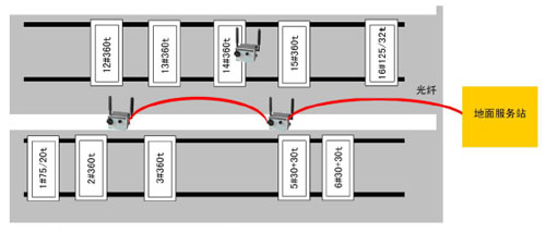 說(shuō)明: 1、2個(gè)地面無(wú)線網(wǎng)絡(luò)基站安裝在起重機(jī)大車(chē)跨的左右兩端中間位置,通過(guò)光纖連接連接到地面工作站交換機(jī)。 下圖為一個(gè)無(wú)線基站布置示意圖: